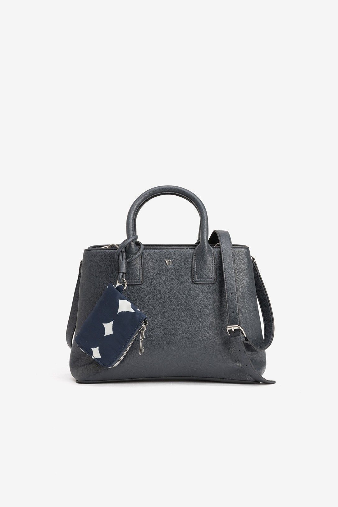 Bolso city efecto piel con dos compartimentos, cierres superiores de cremallera y bolsita extraíble de nailon estampado. Asas de mano fijas y correa de hombro ajustable y extraíble. Bolsillo interior con cierre de cremallera. Tamaño mediano.
