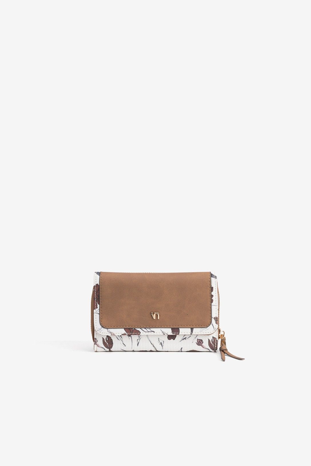 Porta monedas en tonos marrones con estampado floral, cierre de cremallera y múltiples compartimentos interiores.